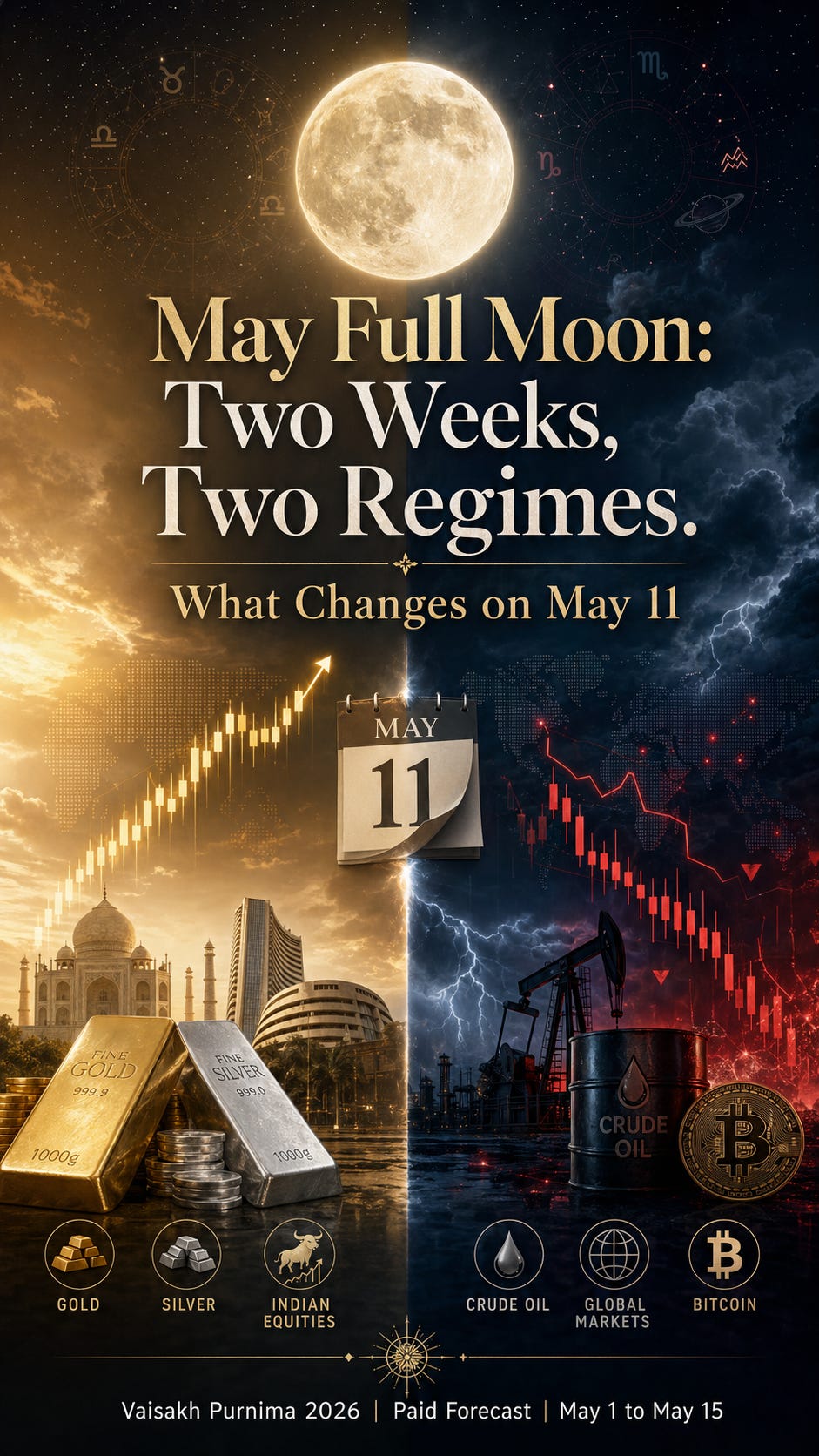 Three readers asked me the same thing this week: “Is this a good time to hold gold into the Full Moon or take profits?” Fair question. Gold has had a strong run. The Full Moon lands on a Friday this month, mid-session for US markets, and the planetary setup is unusually clear about what works right now and what is going to shift a week later. There are two distinct regimes in this 15-day window, and missing the switch point on May 11 is the main risk.