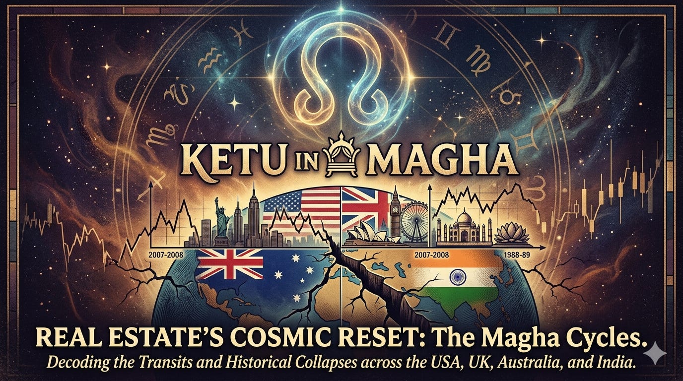 Ketu is a shadow point in Vedic astrology. A simple way to think of it: a force that strips assets back to their real value, cutting through whatever is inflated or over-priced. Magha is a stretch of sky associated with authority, ancestral wealth, and inherited property. Real estate sits squarely in that territory.