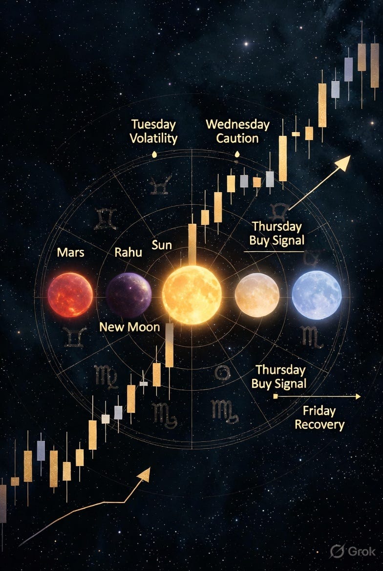 The chaos from last week was mostly driven by Mars and Rahu sitting within 2 degrees of each other while Mars was deeply combust the Sun. That combination (called Angarak Yoga, a Mars-Rahu conjunction that historically correlates with sudden sharp moves in commodities) burned through its most aggressive energy when Mars was at its closest to the Sun. That orb is now widening. The crash energy is largely spent.